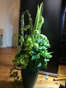 On 7th June we were delighted to welcome Angela Hyland from St Austell who gave us a very entertaining afternoon with “Flower Power”. This is one of her lovely designs which we all wanted to win. The combination of lime green and white is irresistable!